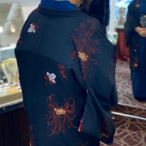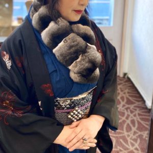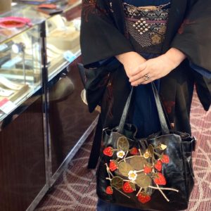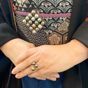 「ファッション感覚で気軽に着られるの」とおっしゃっていたデニムのお着物。そちらに合わせていらっしゃったのは、流行に左右されない本物志向の帯と羽織、そして黒蝶真珠の帯留めと洗練されたジュエリー…….