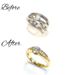 ゴールドの地金が若々しさや華やかさが強調され、お召し物を選ばない、お使いいただき易いリングに生まれ変わりました。