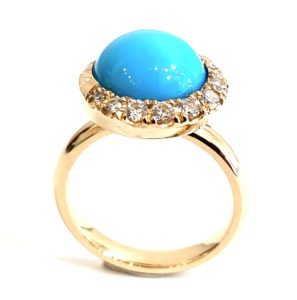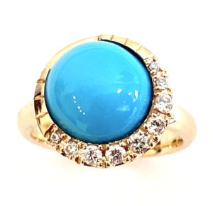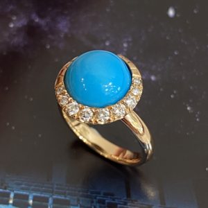 クレセントムーンのモチーフに敷き詰められたダイヤが、色むらもなく艶やかなトルコ石の魅力を一層引き立てます。