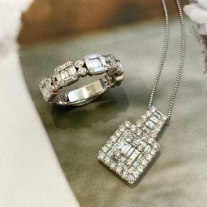 シャープな輝きのバゲットカットと、煌く輝きのラウンドカットが融合するとモダンでクラシックなオーラを纏うジュエリーに。