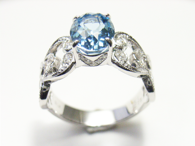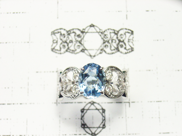 アーム部分はデザイン性のあるモチーフにメレダイヤを散りばめ、ミル打ち装飾した手の込んだおつくりでございます。透かし柄がまろやかな大人の魅力を与え、アクアマリンの石座にもメレダイヤを配せておりますので、四方から見てもダイヤの存在感と華やかさのある計算された美ラインでございます。高さも出しておりますので、気品漂う程よいボリュームで、世界に1つしかないとっても素敵なリングに仕上がりました。