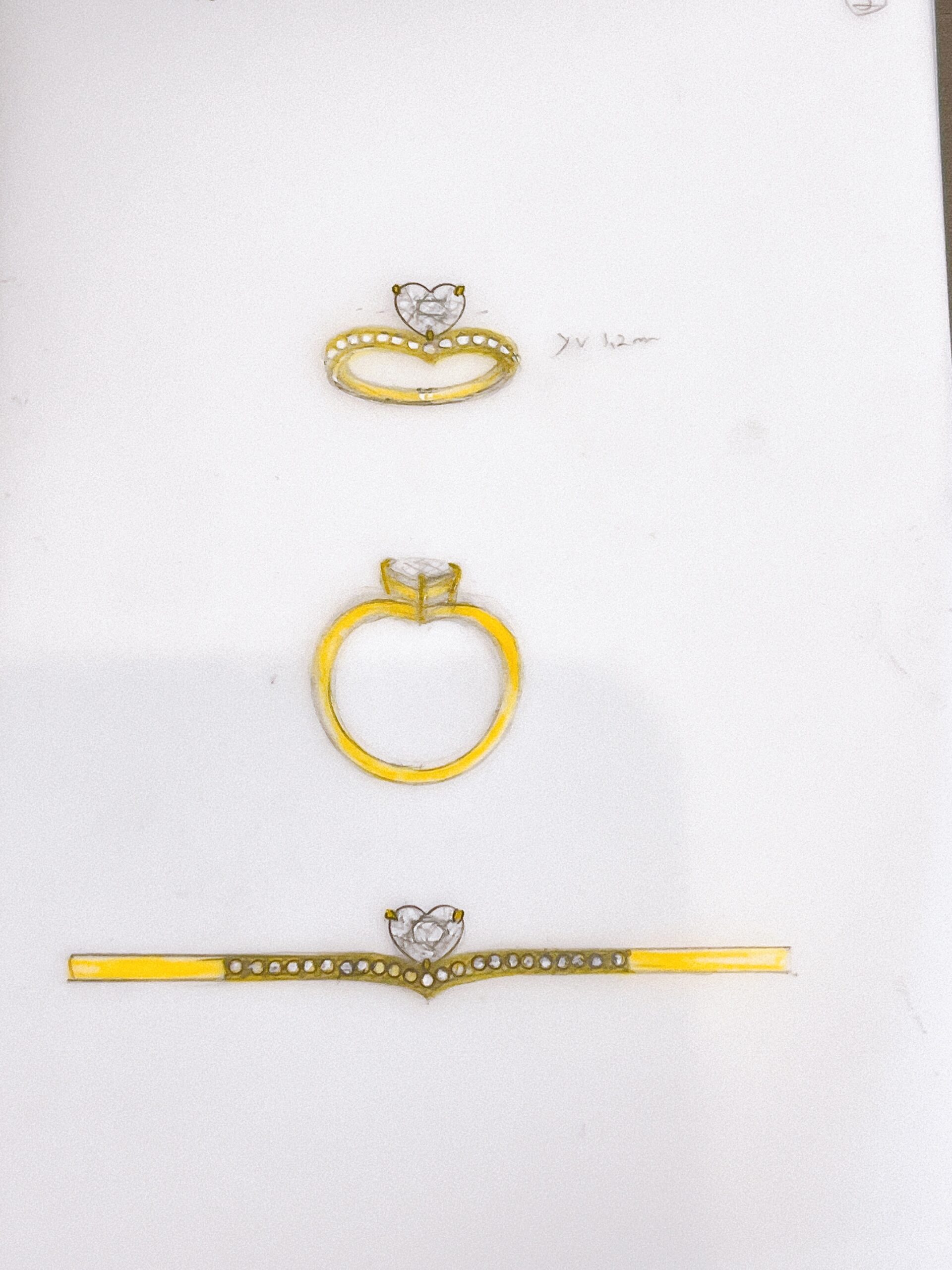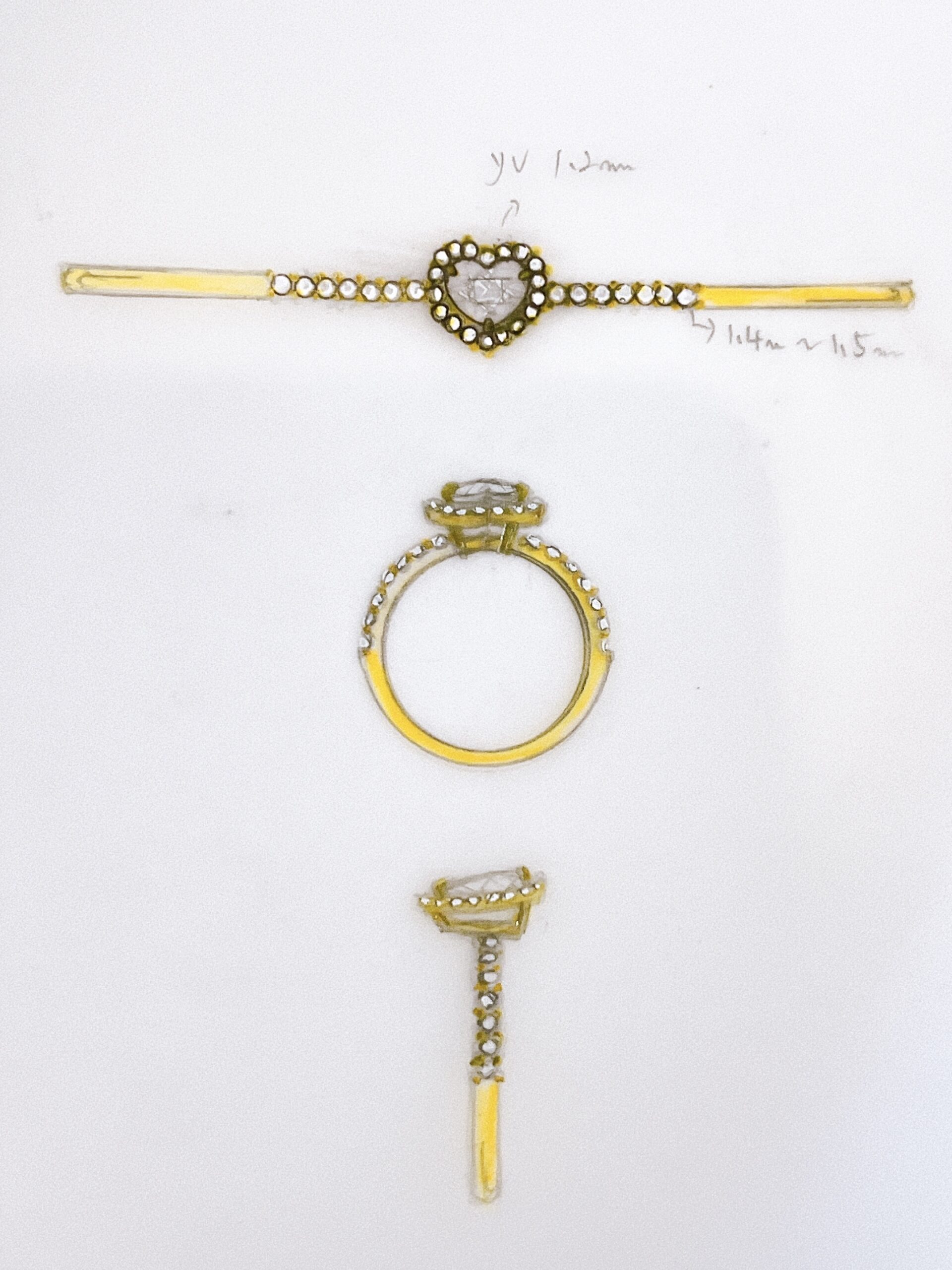 そこで、このハート型を最大限に見せるには、取り巻きにするよりシンプルにした方がいいと思いましたのでV字の上にセットするデザインをご提案いたしました。