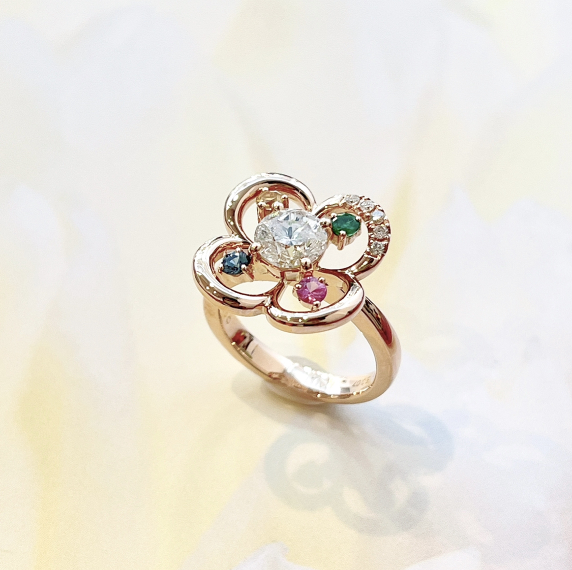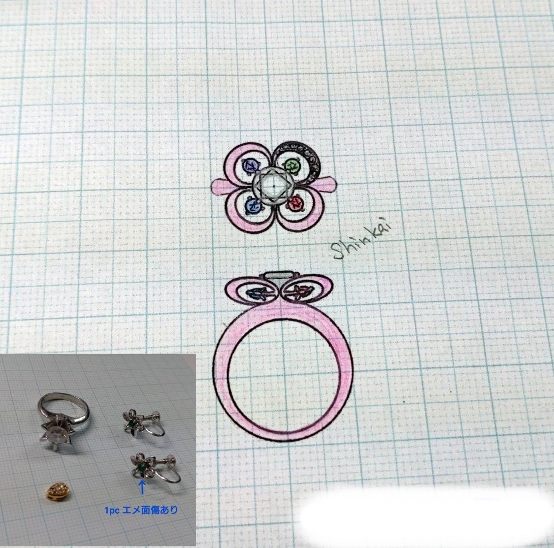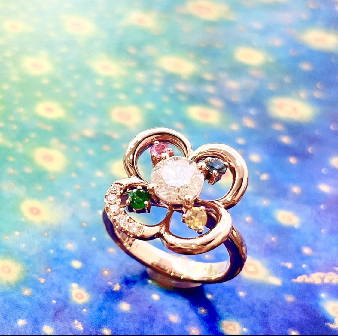 他のお客様の作品をご欄になっていただきますと、こんな感じ好き!とおっしゃってくださったので、そのデザインをヒントにデザインを考えました。カラフルになるように他のカラーストーンも使いました。
