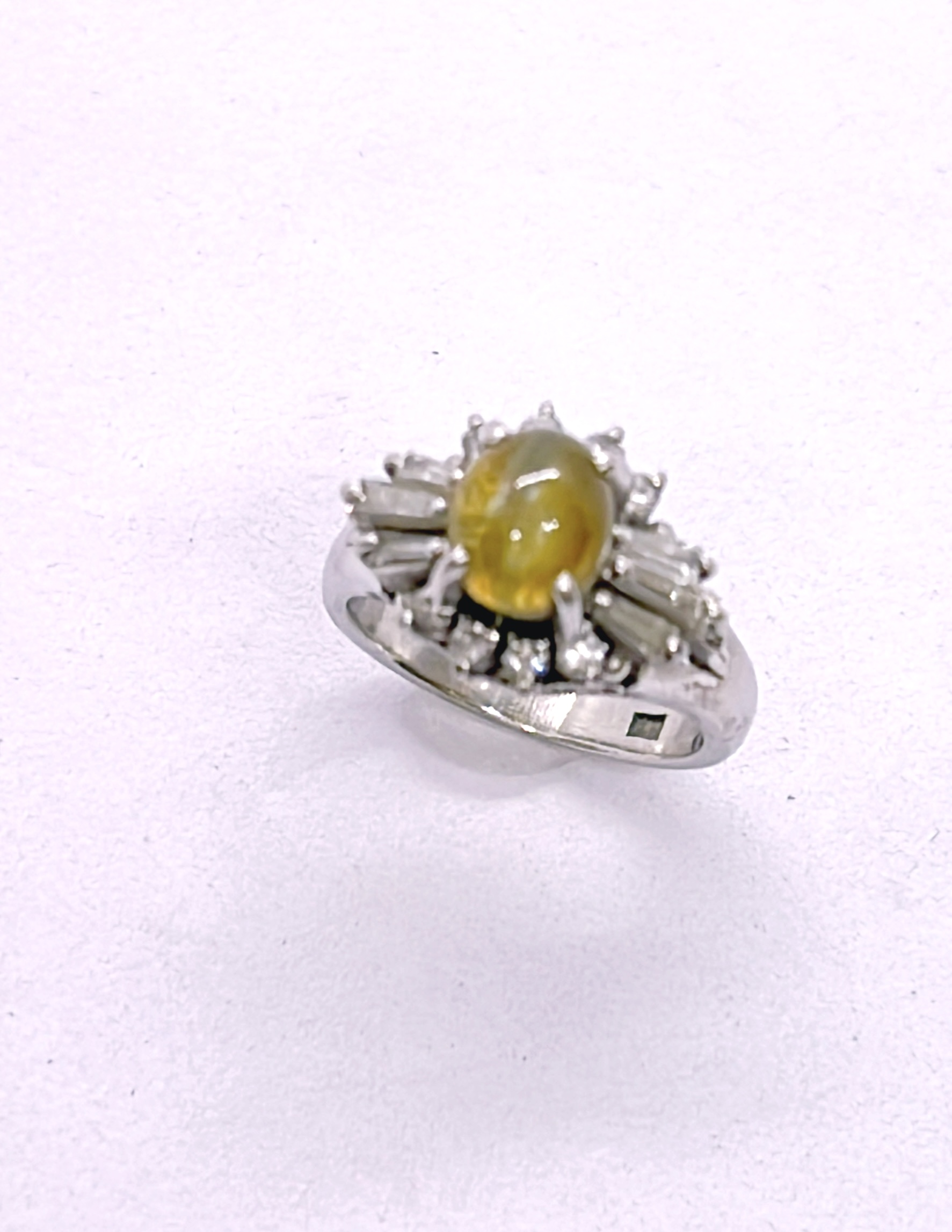 沢山お持ち込みいただいた中の一つでクリソベリル・キャッツアイのリングは、昔に流行したプラチナ台にバケットカットとラウンドカットのダイヤモンドをあしらった取り巻きタイプの時代を感じさせるデザインでした。さすがにこちらのデザインでは、40代のお客様がするにはちょっと・・・と思い、サイズ直しのご提案ではなくジュエリーリフォームをご提案させていただきました。