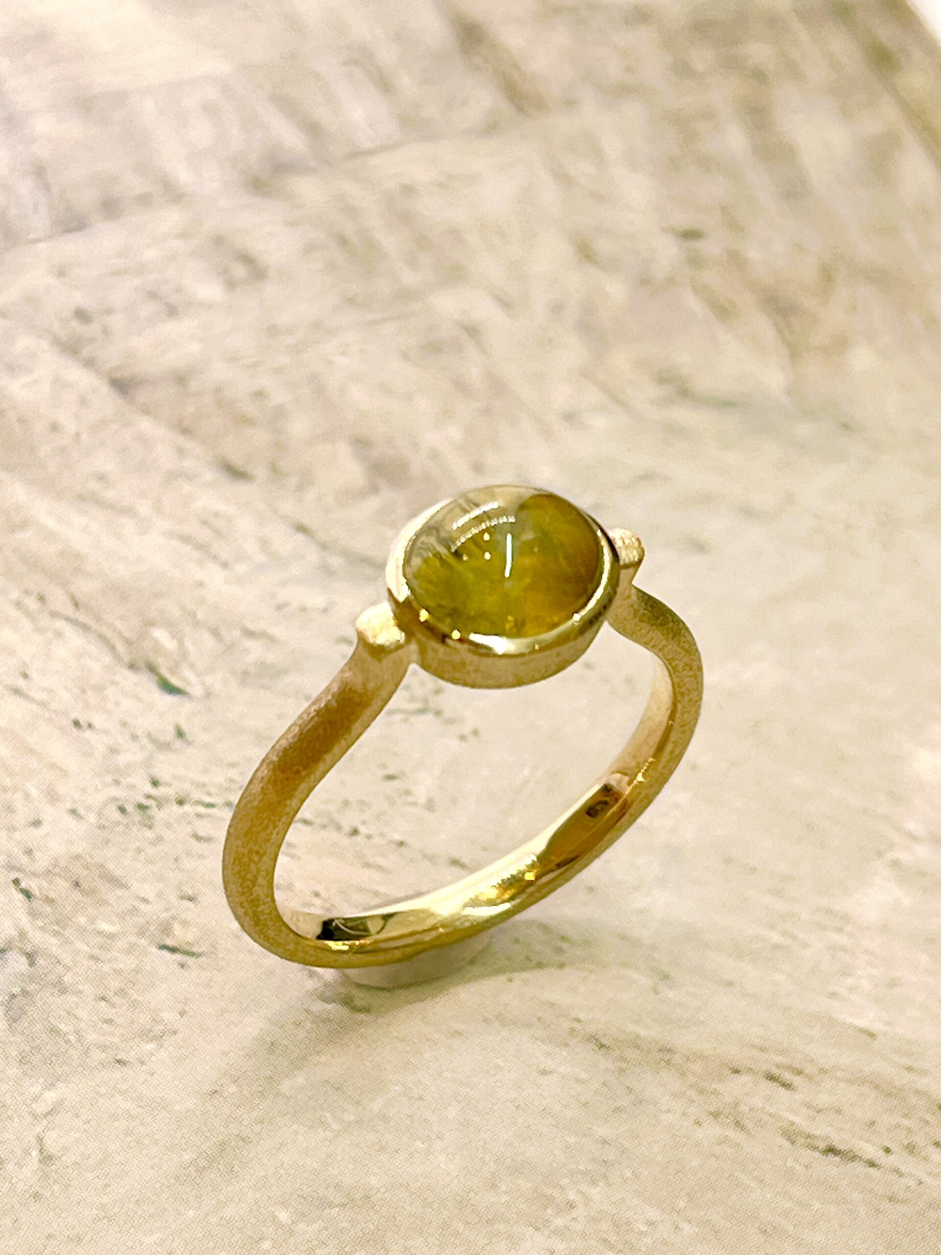 まず、今回のクリソベリル・キャッツアイですが黄色から薄黄緑色の半透明で中央にシャトヤンシー(猫目)と呼ばれる特殊効果を持つお石です。お石を傾け光を当てるとまるで猫の目のような模様が浮き出てくるお石です。ただし、色目が地味なので通常は脇石にダイヤモンドを入れることが多いのですが今回は、あえて脇石を入れずに中石をシンプルなベゼルセッティングにして腕も細目におつくりしました。そして、地金表面にアンティークを思わせる彫を全周に入れました。