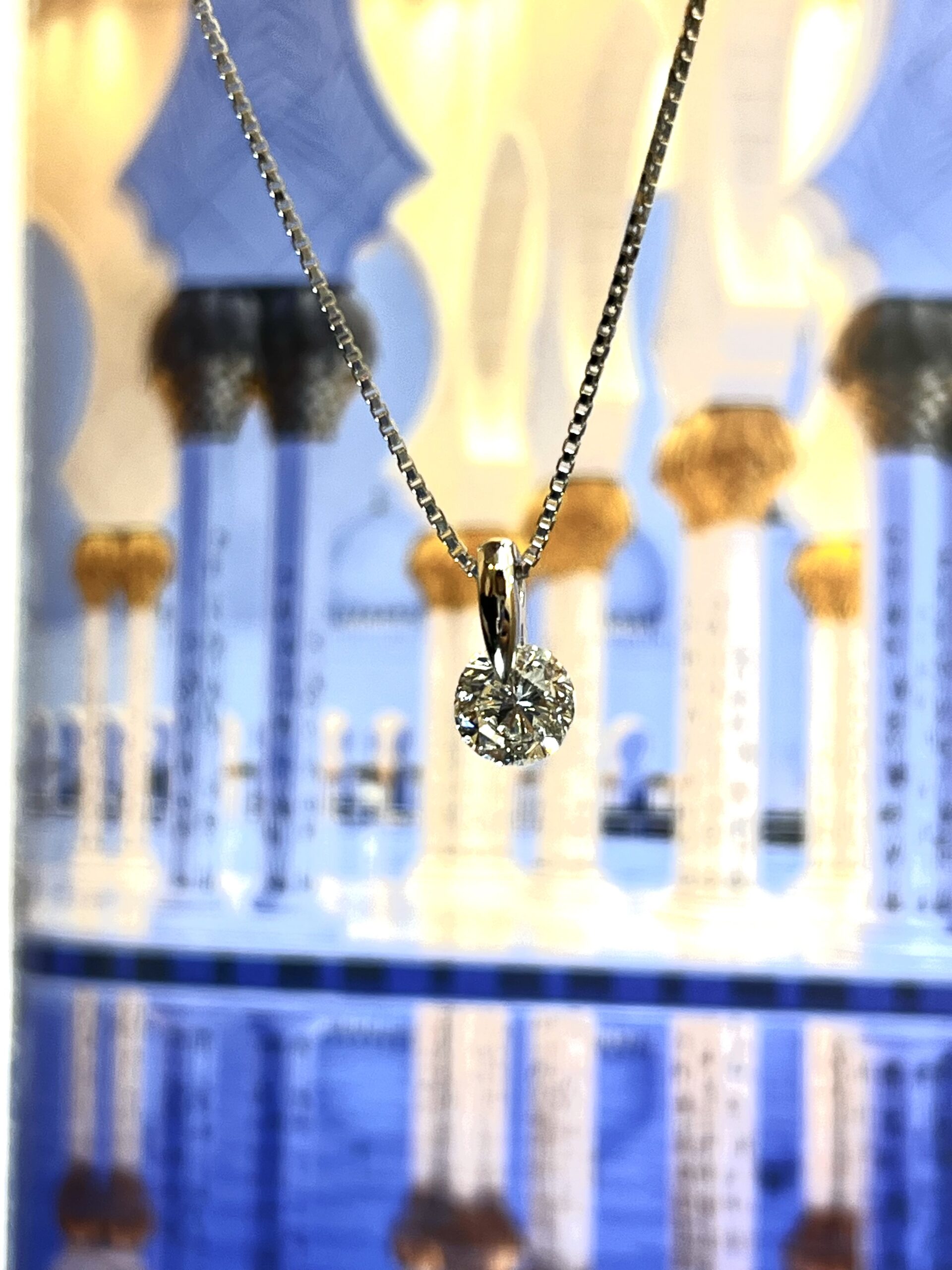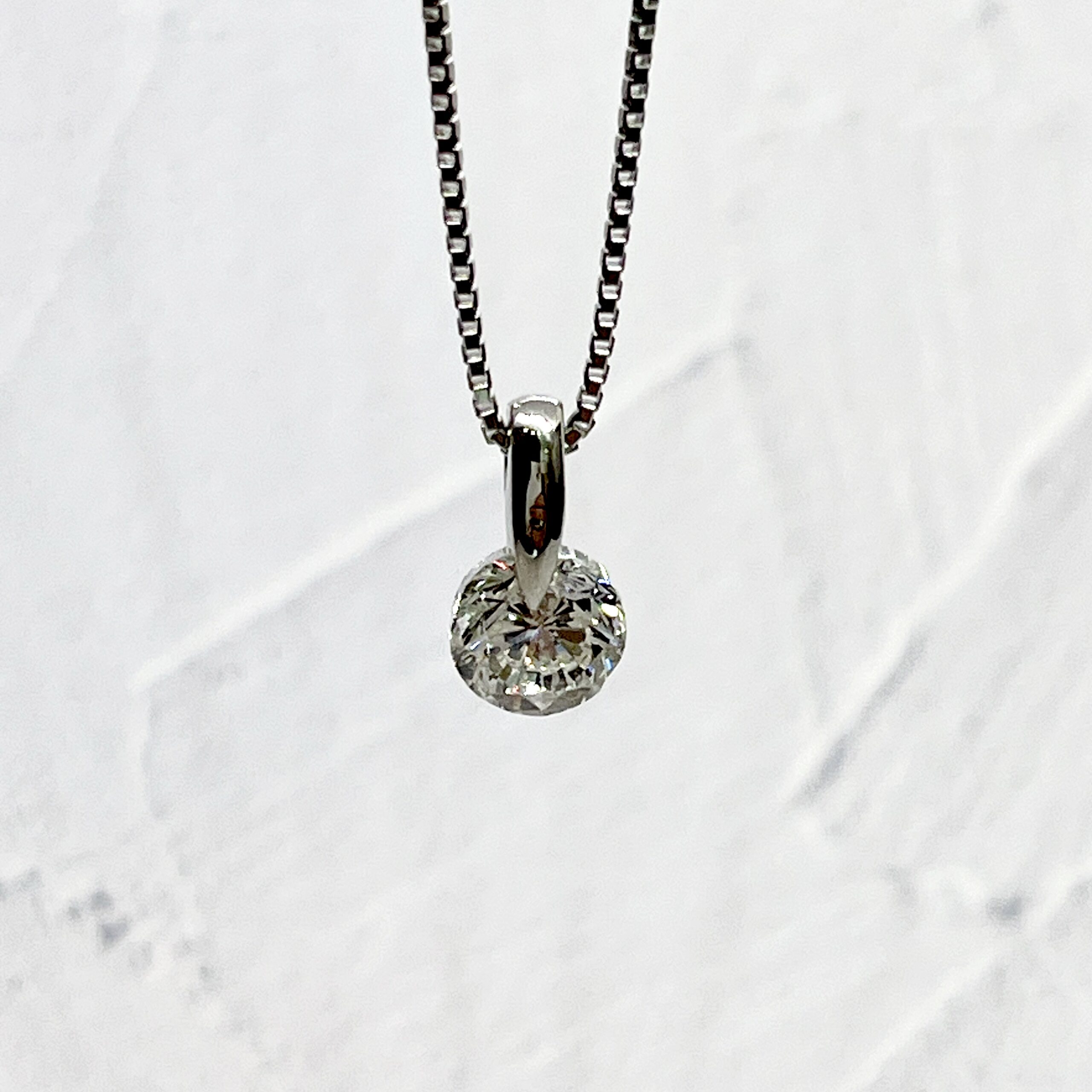 今回のお石もグレード的に申し分ない綺麗なお石でした。やはり、1キャラットあると迫力がありダイヤモンド本来の美しさが際立ちます。また、ネックレスチェーンは、定番のベネチアンチェーンが爪の鏡面仕上げの光り方と相まって統一感がありバランスがいいと思います。一点留めは、内包物の量やカットで作成できない時もありますがシンプルかつお石本来の美しさを最大限に見せることができるデザインです。これぞシンプル・イズ・ベストという感じですね