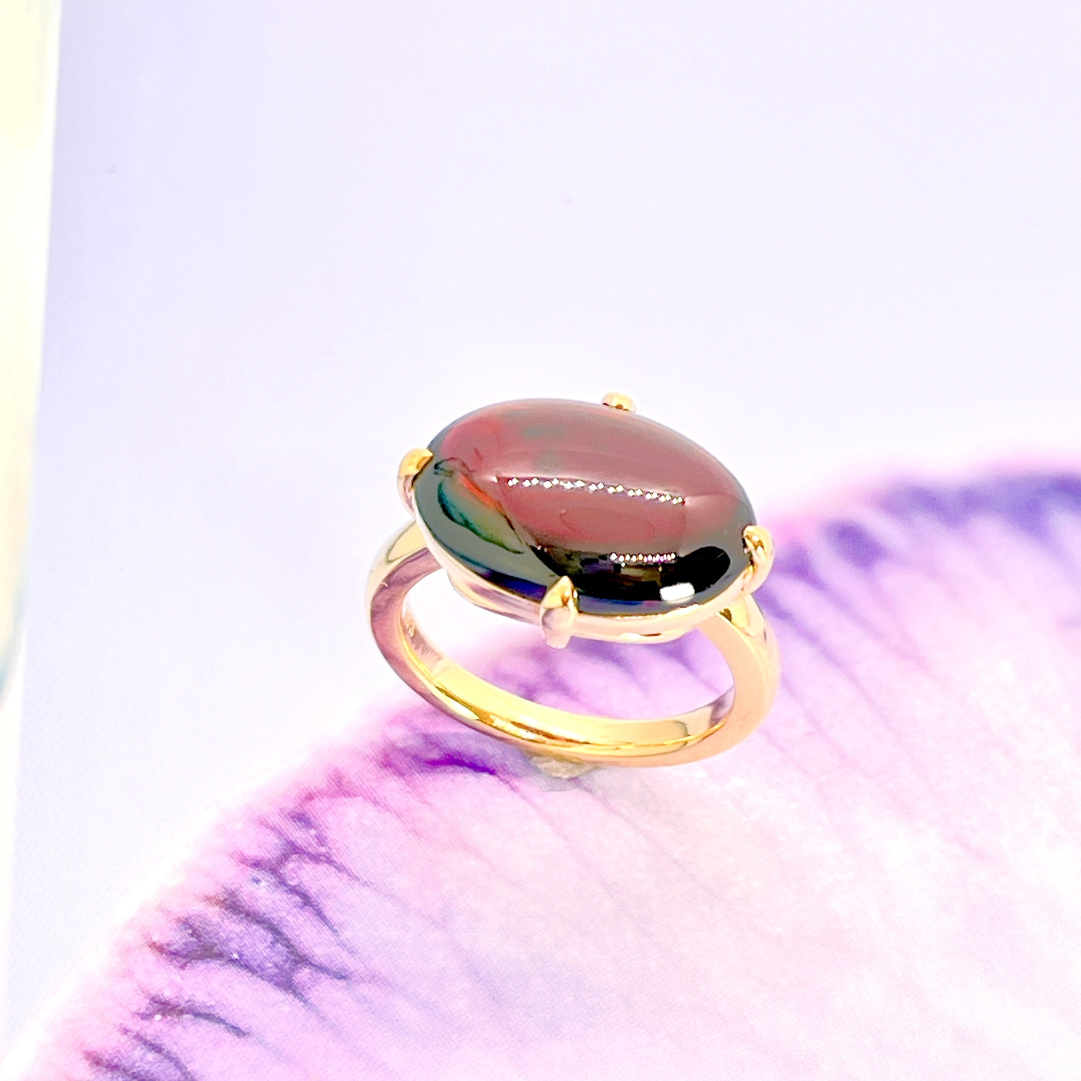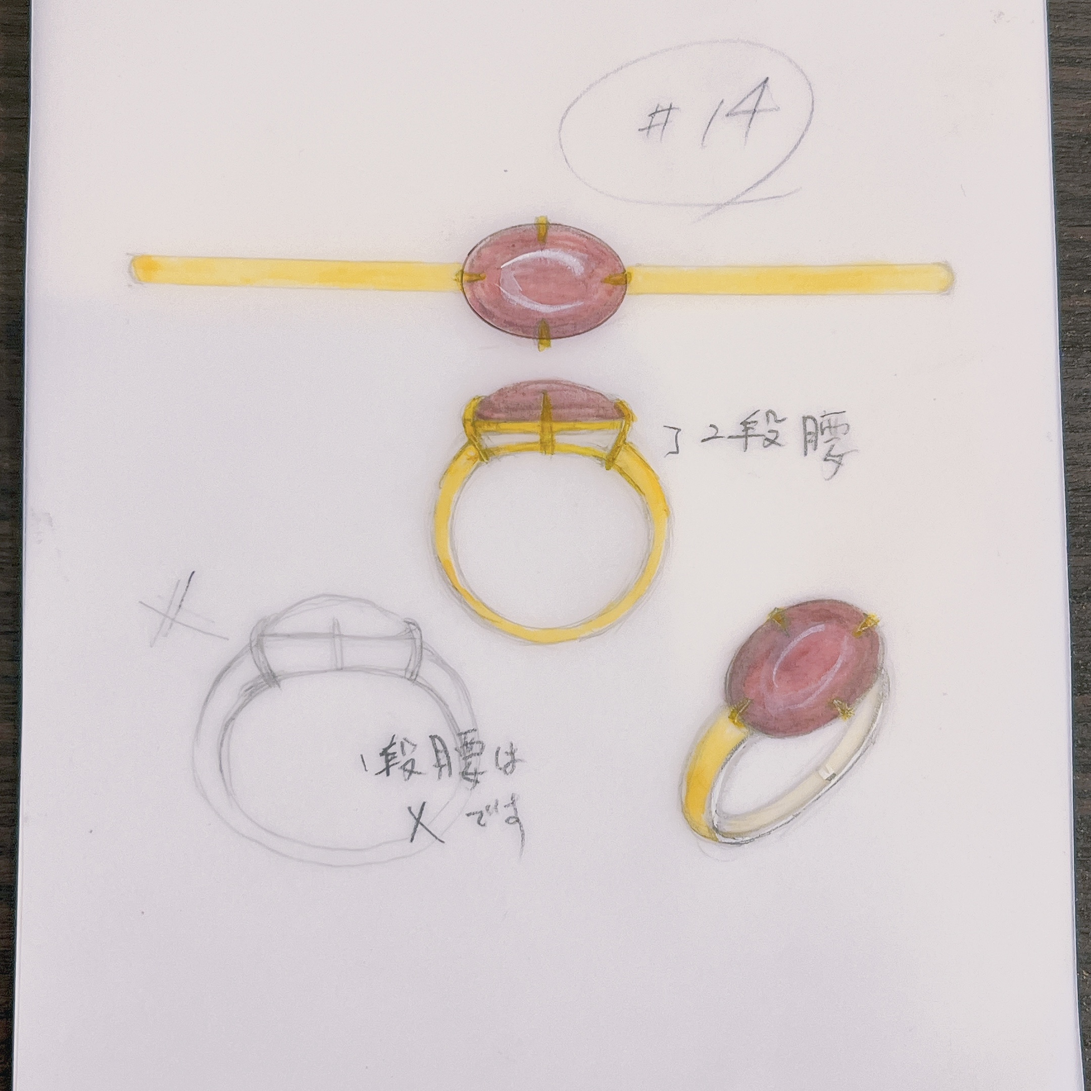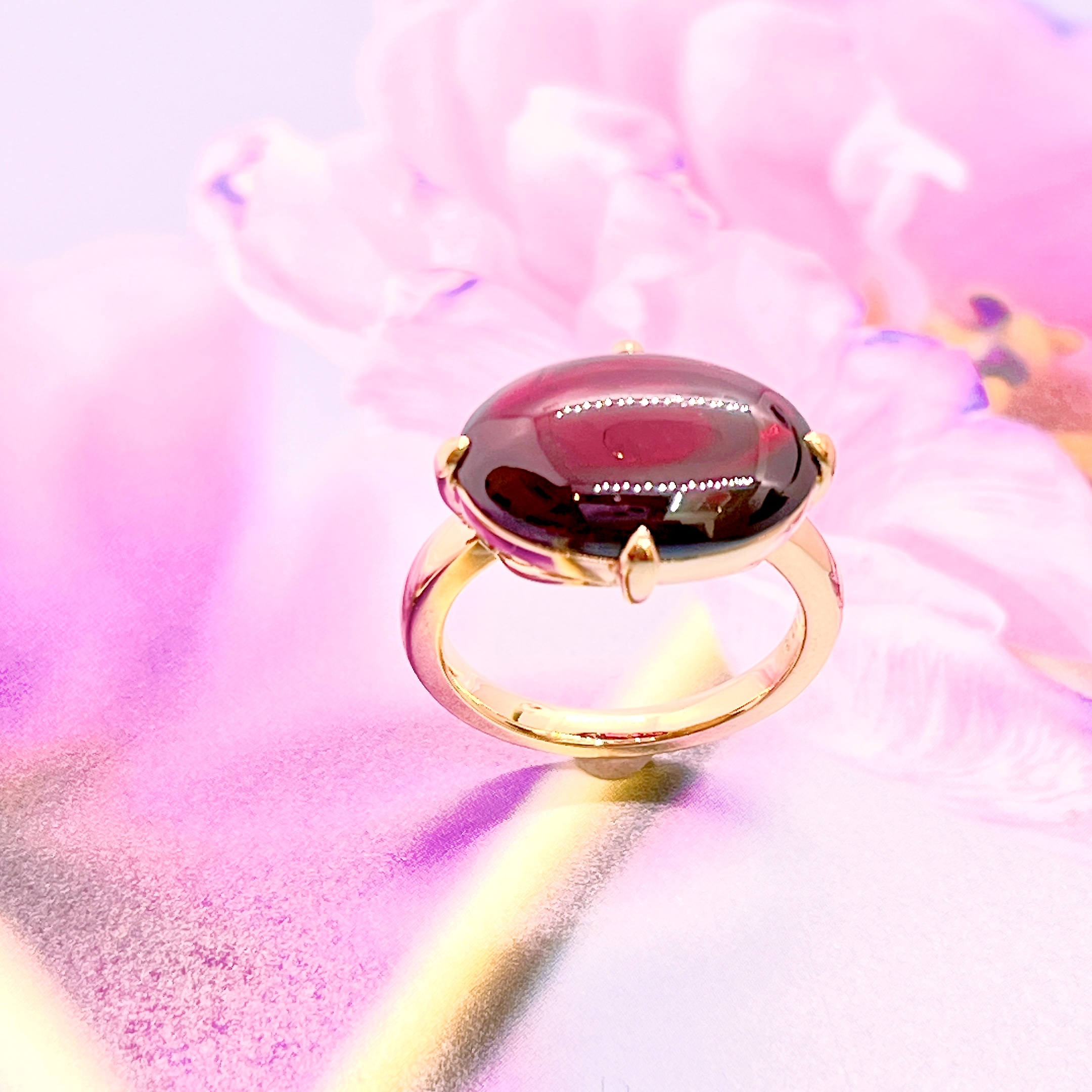 落ち着いた深みのある色のアルマンダインガーネットは、サイズも大きくホワイト系の地金でお作りすると地味になりすぎると思いK18イエローゴールドで台座を作りました。お石を横置きにすることによりモダンな印象になります。今回は、あえてメレダイヤモンドを使わずに日常使いしやすいデザインに仕上げました。