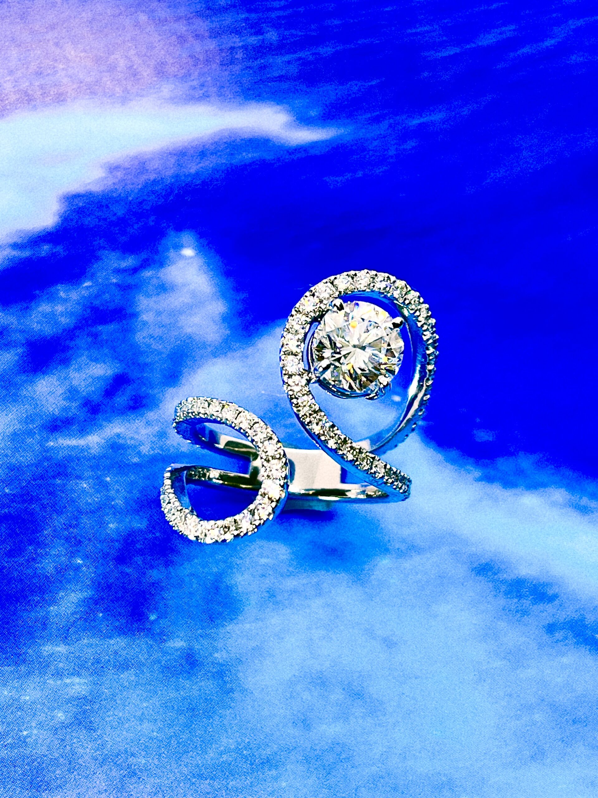幅が広いですが肌が透ける部分が多く圧迫感やもたつき感は、一切ありません。そして流れるラインのメレダイヤモンドは、トータル1.0ct以上を使いました。デザイン的に人差し指でしていただく事もあると思いましたので、腕の下までダイヤモンドを入れないと地金部分が目立ってしまい高級感が失われますのでギリギリのところまでダイヤモンドを配置しております。