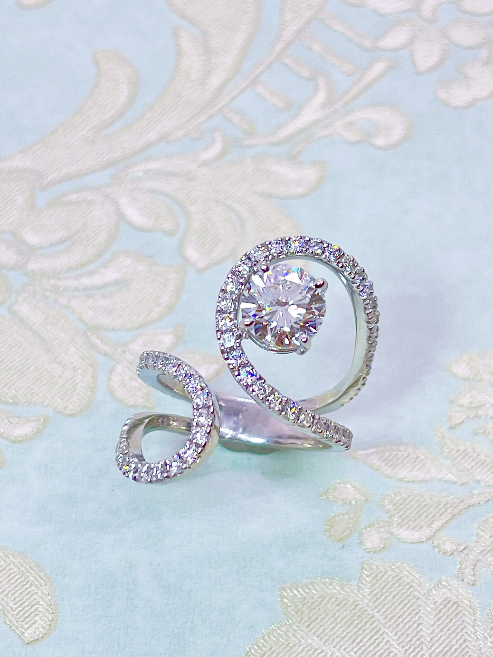 今回は、お母さまから受け継がれた大粒1.6ctラウンドカットのダイヤモンドをリングにリフォームご希望でご来店いただきました。当初は、マイクロパヴェセッティングの取り巻きデザインをご希望されておりました。しかし、お客様の雰囲気、ライフスタイル、お好みのテイスト・・・お話を伺えば伺うほどに他のデザインの方がきっとお似合いになると確信して流れるようなメレダイヤモンドのライン上にお持ち込みの1.6ct一粒ダイヤを配置するデザインをご提案させていただきました。地金の色は、イエローゴールドが最近のお好みとの事でしたがプラチナでご提案させていただきました。