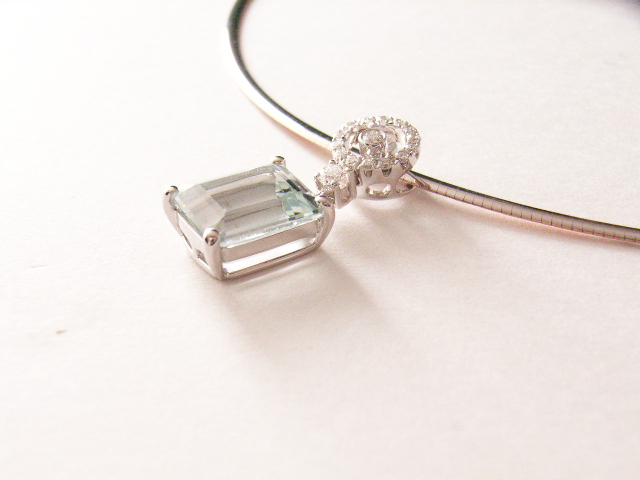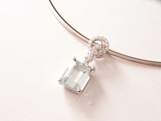 涼しげなアクアマリンを上品に見せる為、石座はすっきりと、華やかさを出す為バチカン部分はメレダイヤを配せ、デザイン性のあるペンダントにお仕上げ致しました。