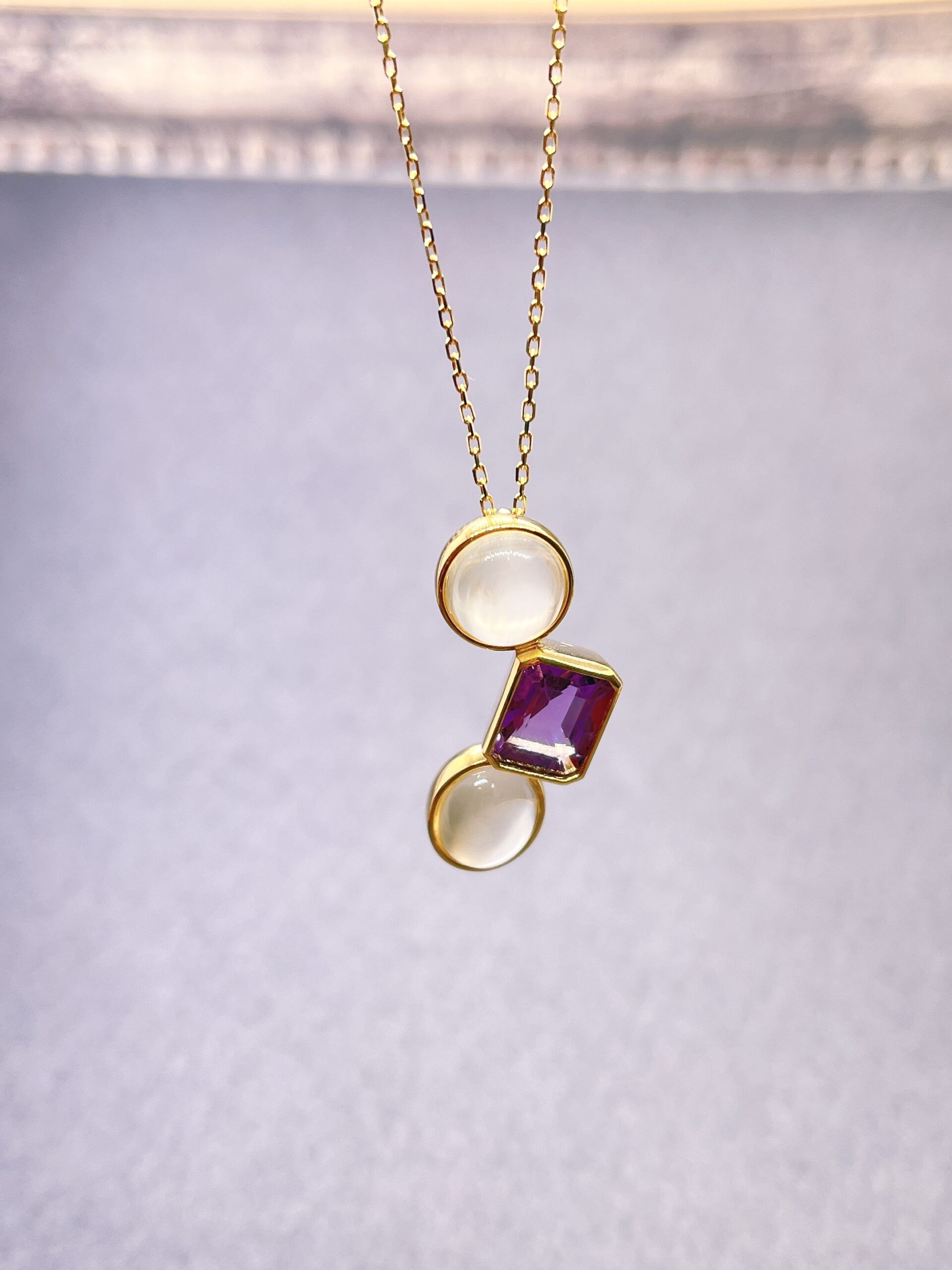 お母様から受け継がれたアメジストとムーンストーンのルースをお嬢様にお似合いになるものでとオーダー頂きました。シンプルな装いでとても身長がお高くスラっとしていらしたので縦長のデザインのペンダントをご提案いたしました。