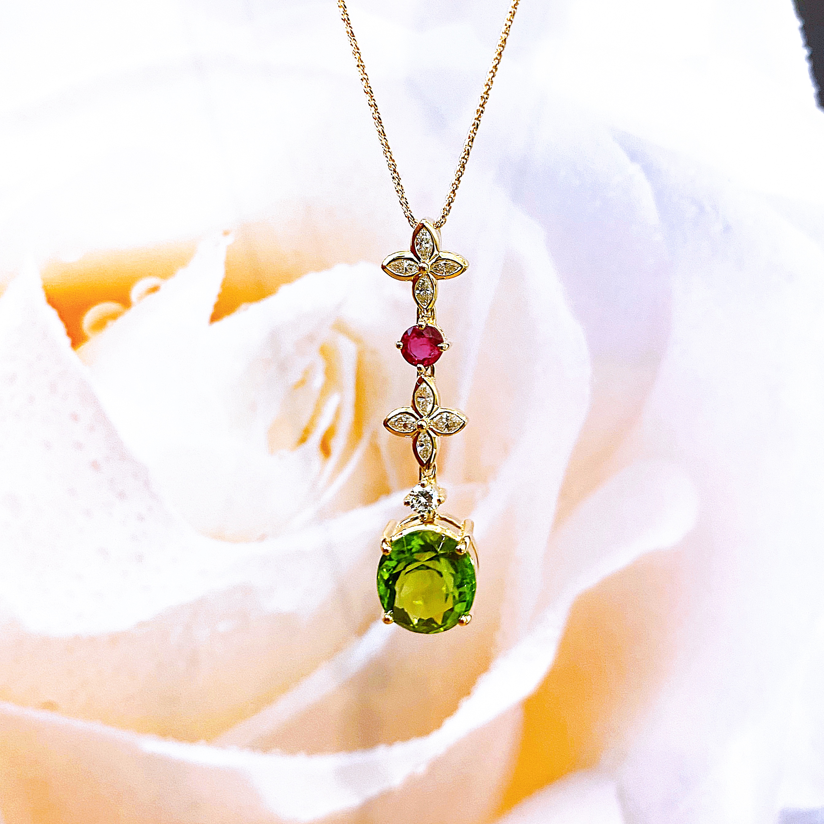 当店に偶々入荷したばかりのペリドットがございましたのでこのペリドットがメインのようになりますがルビーとダイヤメレーを生かしたペンダントはどうでしょうか?ご提案させていただきますとなんと?! ペリドットはお客様の誕生石でした。