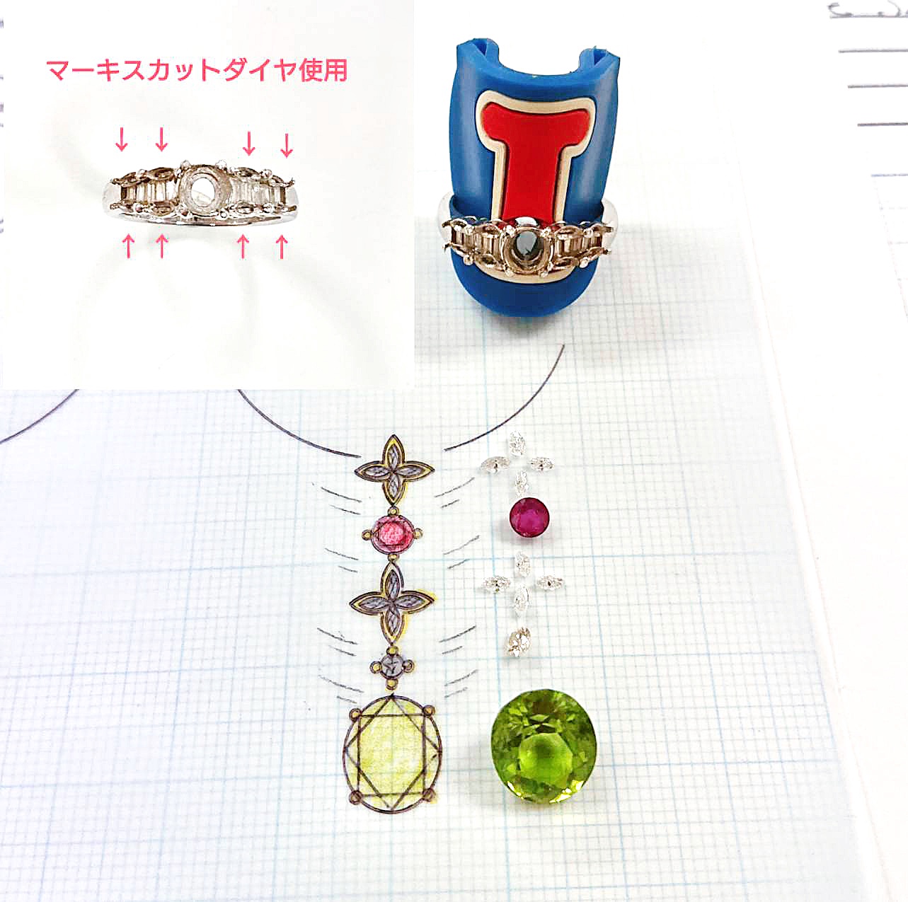 マーキスのダイヤモンドメレーを生かしてお花の形に見立てたデザイン3パーターン考え一番お気に召したデザインを選んでいただきました。