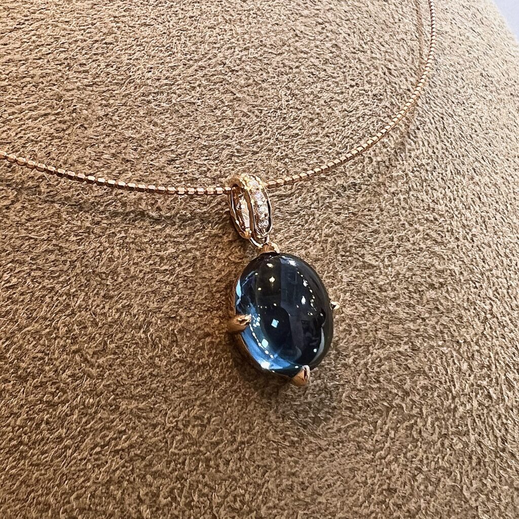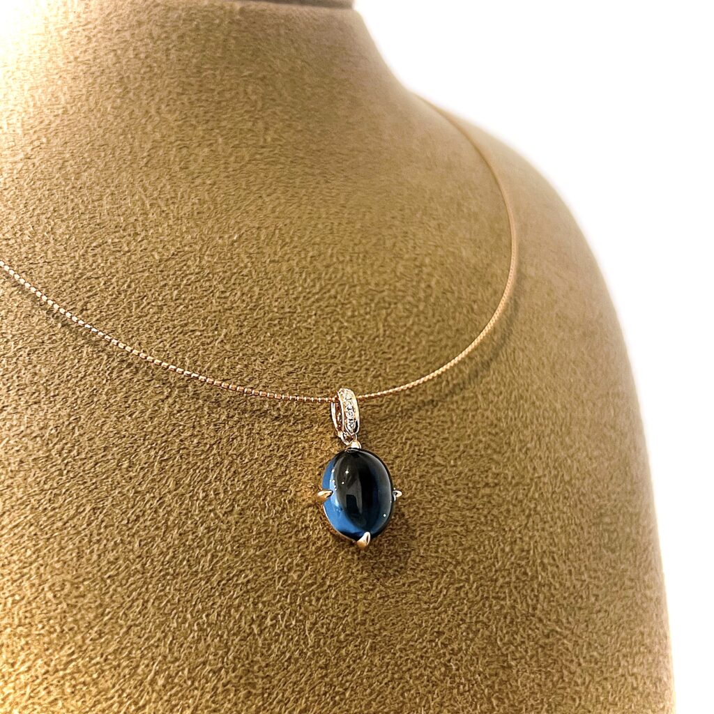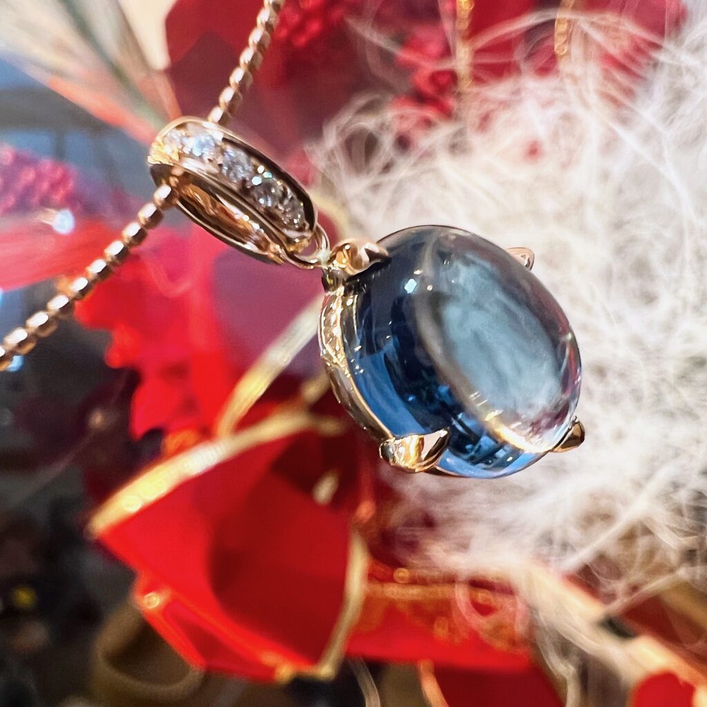 カボションのロンドンブルートパーズです。オーバルカットが主流の中、カボションのロンドンブルートパーズはちょっと珍しいですね。