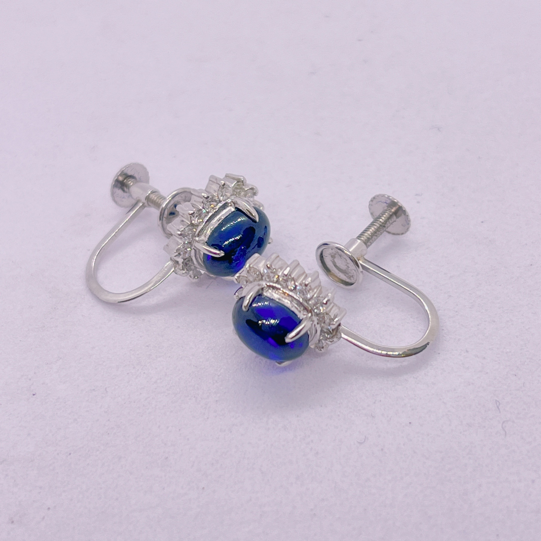 お得意様からのオーダーです。お母さまから受け継いだ部ブルーカラーのカボッションサファイアイヤリングを何かにできないかと…