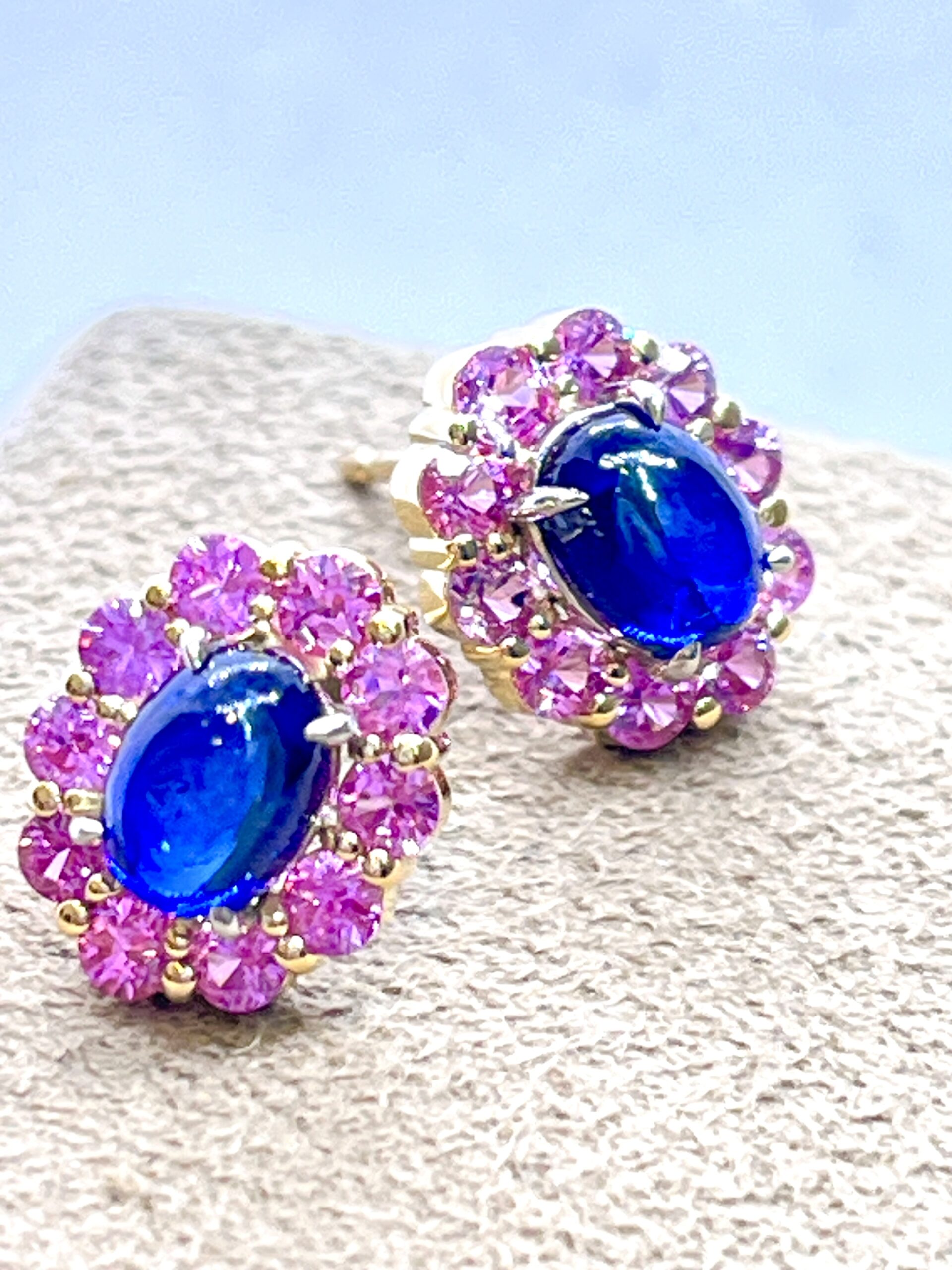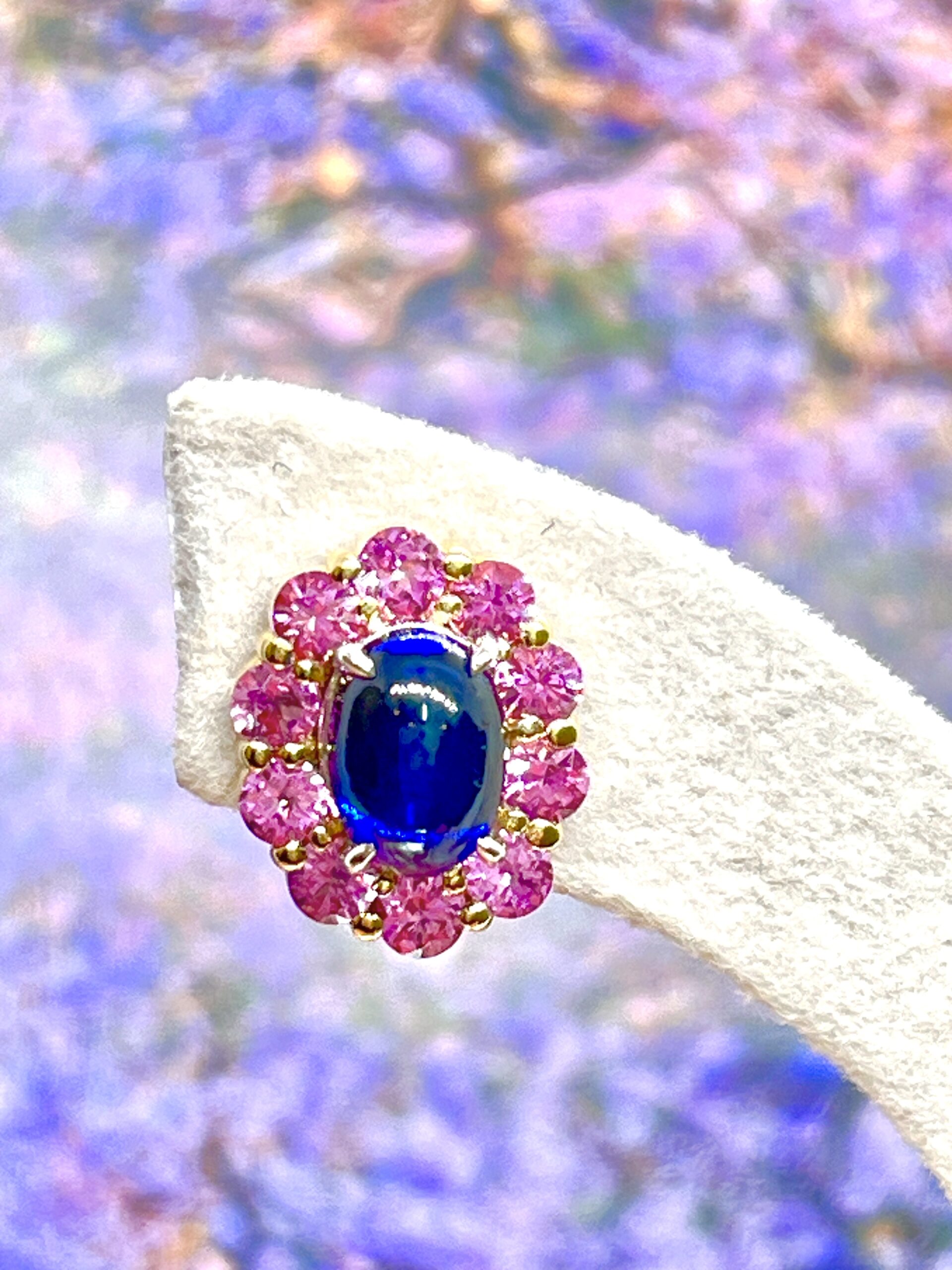 画像では、分かりにくいですがピンクサファイアはK18ピンクゴールドの台座で作りブルーのカボッションサファイアはPt850で台座を作りました。コンビネーションで台座を作ることによりそれぞれのお石のカラーがより一層際立っています。