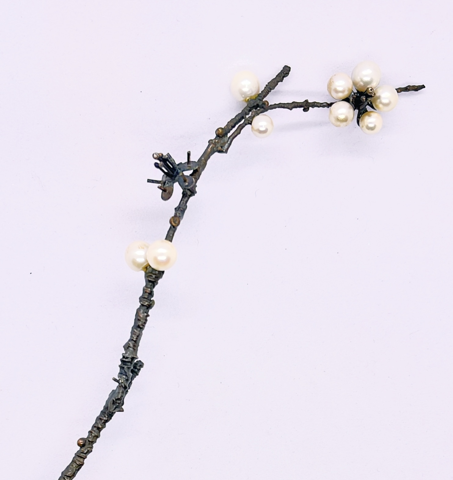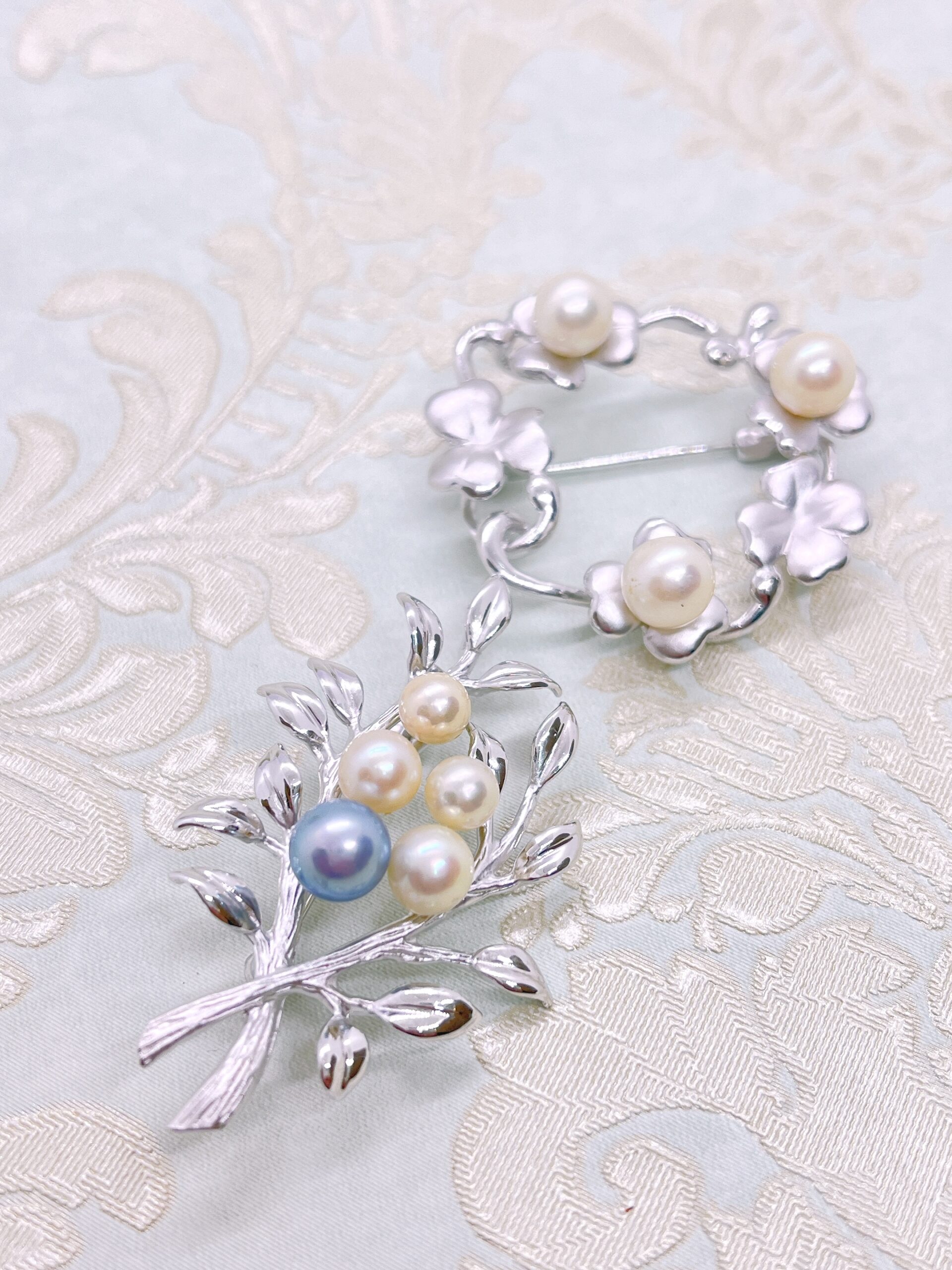 お母様から受け継がれた真珠がいくつも付いたかんざしを息子様のお嫁さん用にジュエリーリフォーム致しました。お若いお嫁さんは、ブローチがお好きだとの事で気に入ったたデザインをカタログから選んで頂き、真珠の配置は、私共にお任せ頂きました。②の方には差し色としてブルー系のパールを追加で入れました。