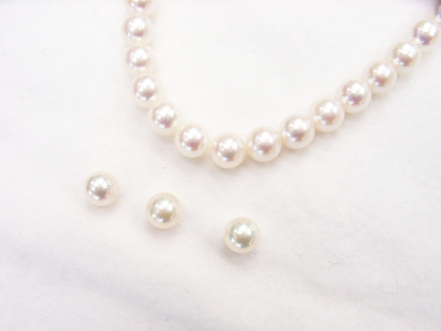 連のパールネックレスは少々長いようでしたので珠を3つ外し、糸替え・調整をいたしました。