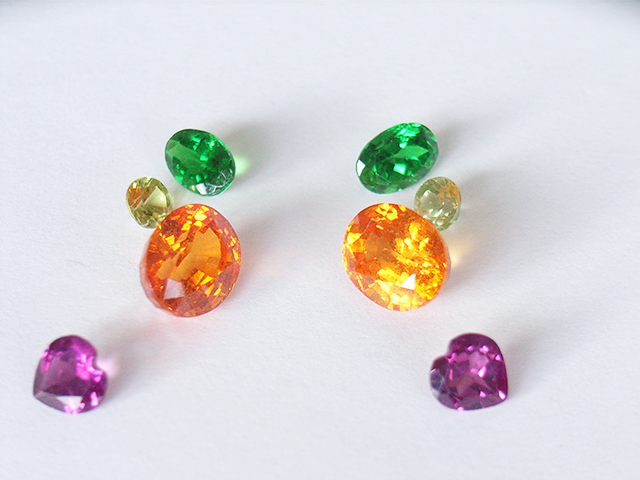 オレンジとグリーンのお石はオーバルカット、パープルのお石はなんとハートシェイプで、思わず乙女心がキュンとなるような愛しさが漂います。