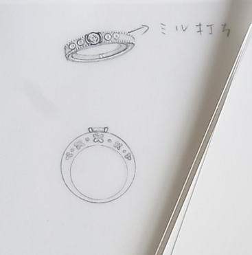いくつかご提案させていただくうちに既製の空枠ではなく、ゼロからデザインを起こすご提案をさせていただきました。お話させていただくうちにダイヤそんなに大きくないのですし、日常使いでしたら婚約指輪だからといってプラチナにこだわらず、ピンクゴールドとプラチナのコンビなどどうですか?コンビネーションはとても使いやすいですよ。反対側のの手にゴールドでもプラチナでもお着けしてもおかしくないですし。