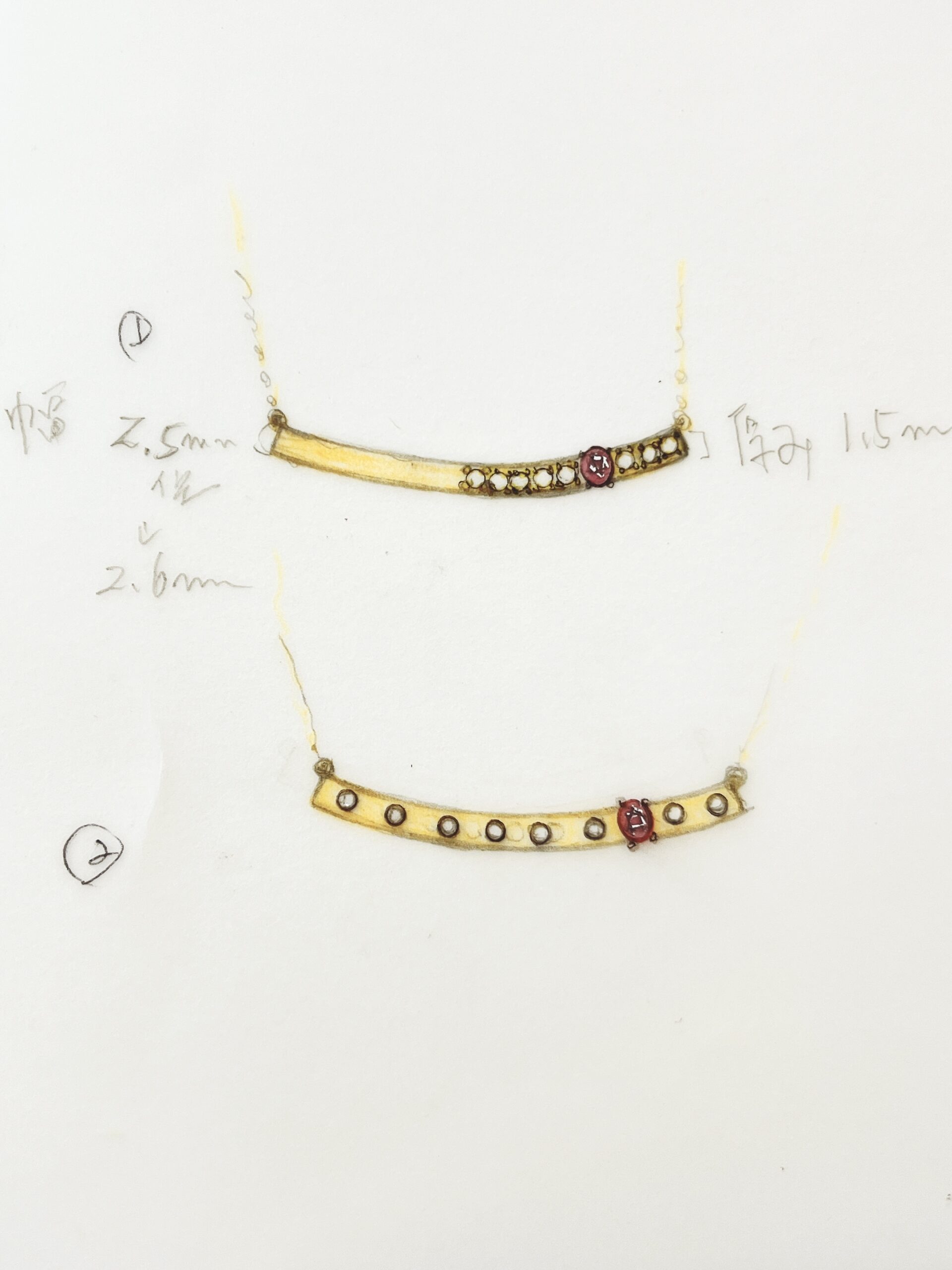 この小さなダイヤモンドもオーダージュエリーなので使えました。デザイン案は2パターン同じ規制枠を使ってダイヤモンドメレーを入れる位置を変えています。
