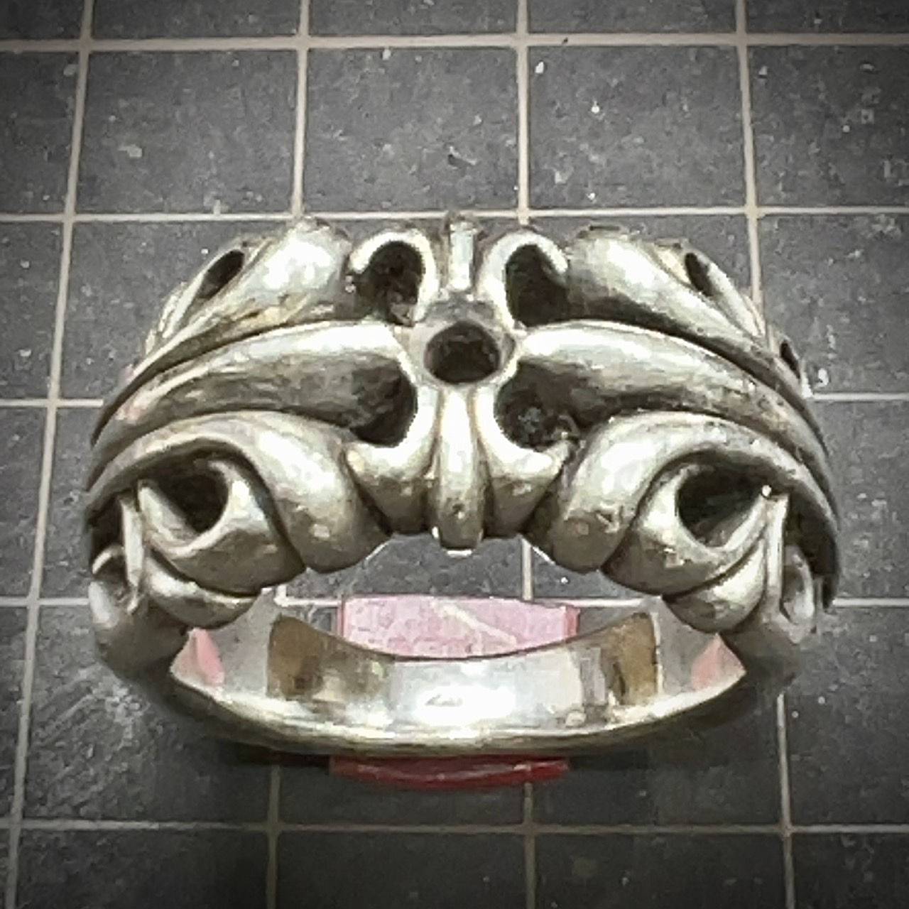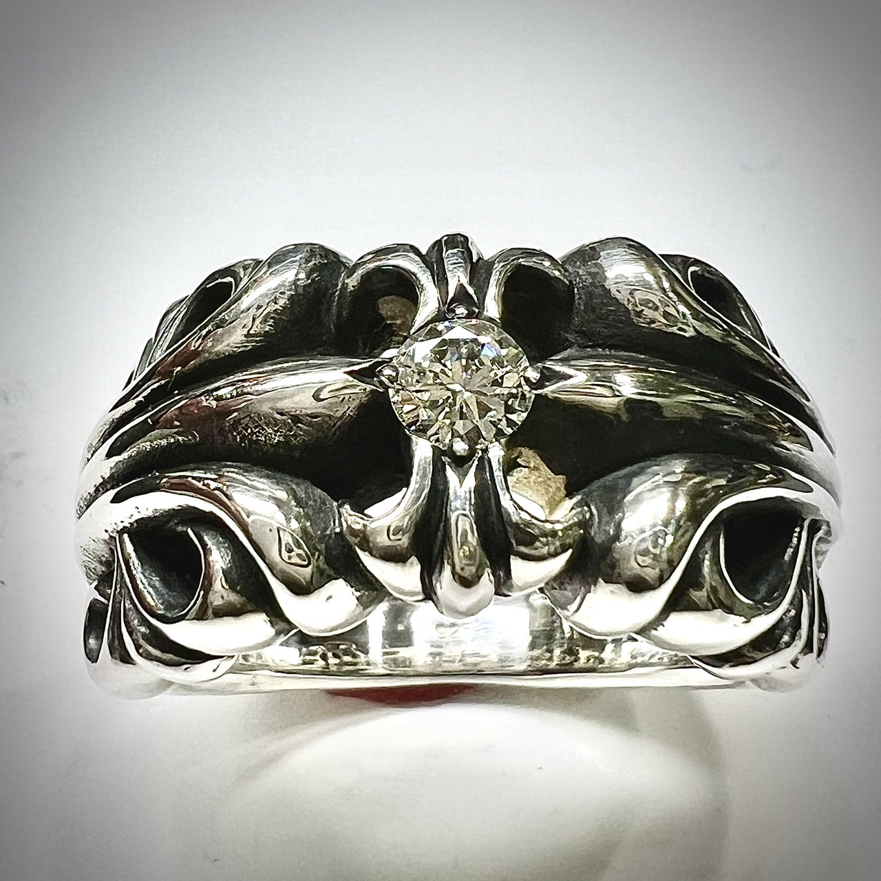 次にダイヤモンドを留める為の座と爪の成型です。次にダイヤモンドを留めて爪を整えてから燻し加工をし、最後に仕上げです。但し、燻し加工を程よく残しつつ仕上げるのはセンスが必要です。残しすぎも取り過ぎもイメージが変わってしまうため、クロムハーツを熟知していないと出来ない加工です。