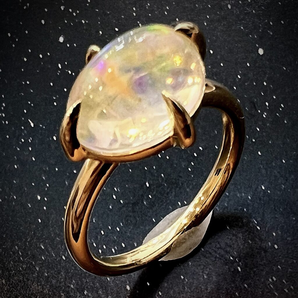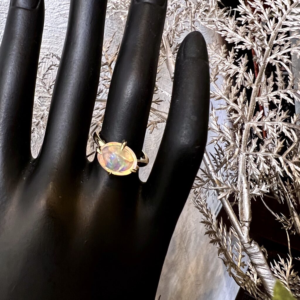 オパールは他のカラーストーンに比べてボワーンとしたお色目なので、ゴールド素材でお作りする事をおすすめしました。なぜなら、ゴールドの方がメキシコオパールの良さが引き立つからです。