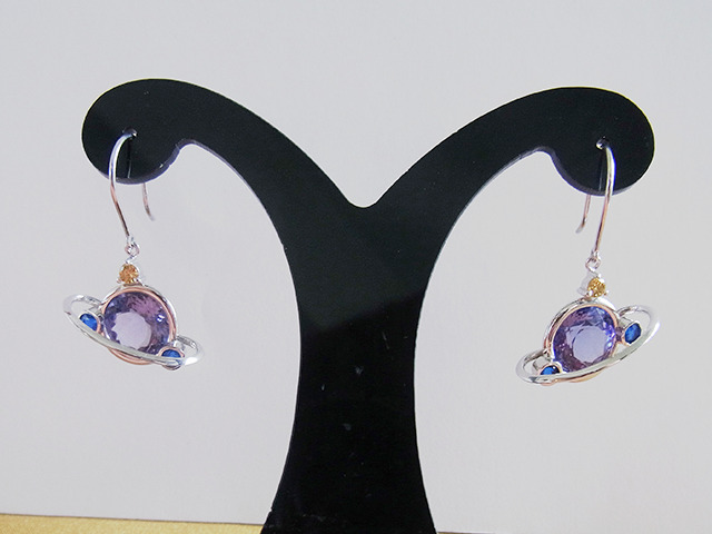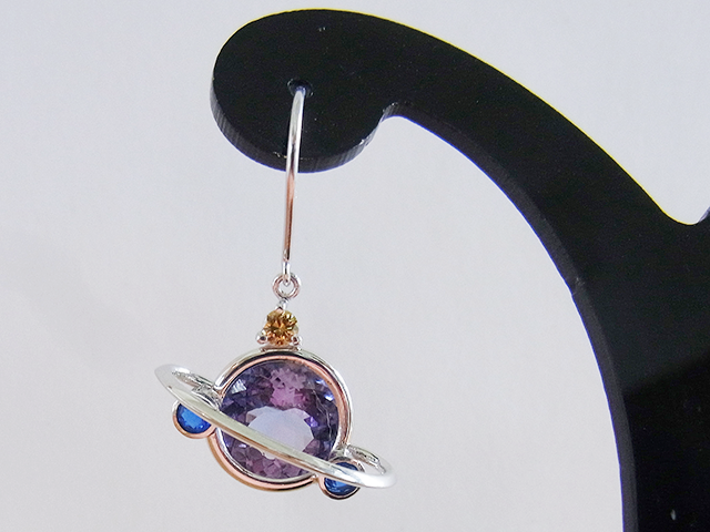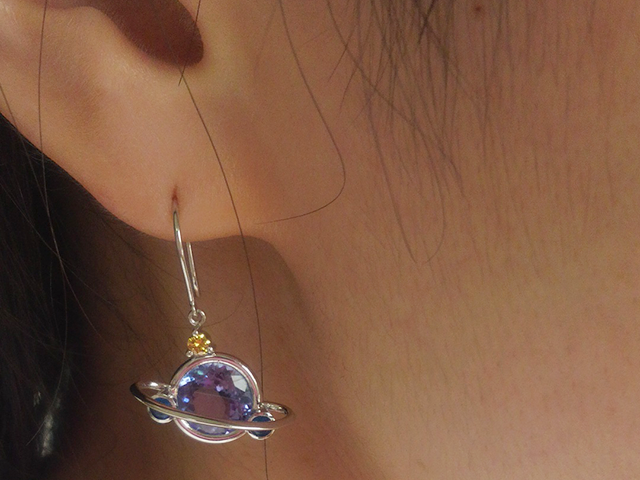 地球(タンザナイト)と、それを取り囲む小惑星(アウインとイエローダイヤ)のイメージでデザインをさせていただきました。