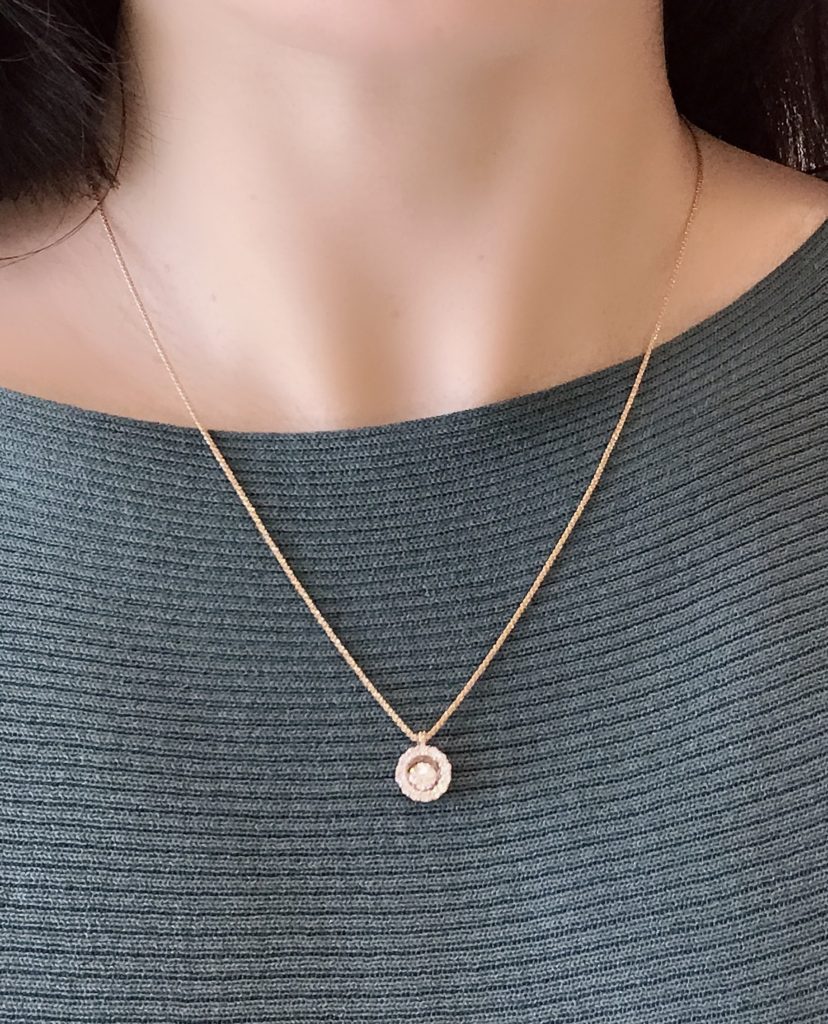 小さい1粒ダイヤペンダントは普段よくお使いになるということ、地金はゴールドがお好きなこと、またお客様の雰囲気や御年齢、活用シーンなどをお聞きし、少し華やかなダンシングストーンをご提案致しました。地金は肌に馴染むピンクゴールドでございます。