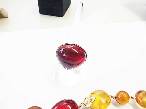 ダイヤなどを散りばめたデザインではなく、琥珀が大きいのでシンプルに周りだけを巻いたポメラート風のデザインにしました。