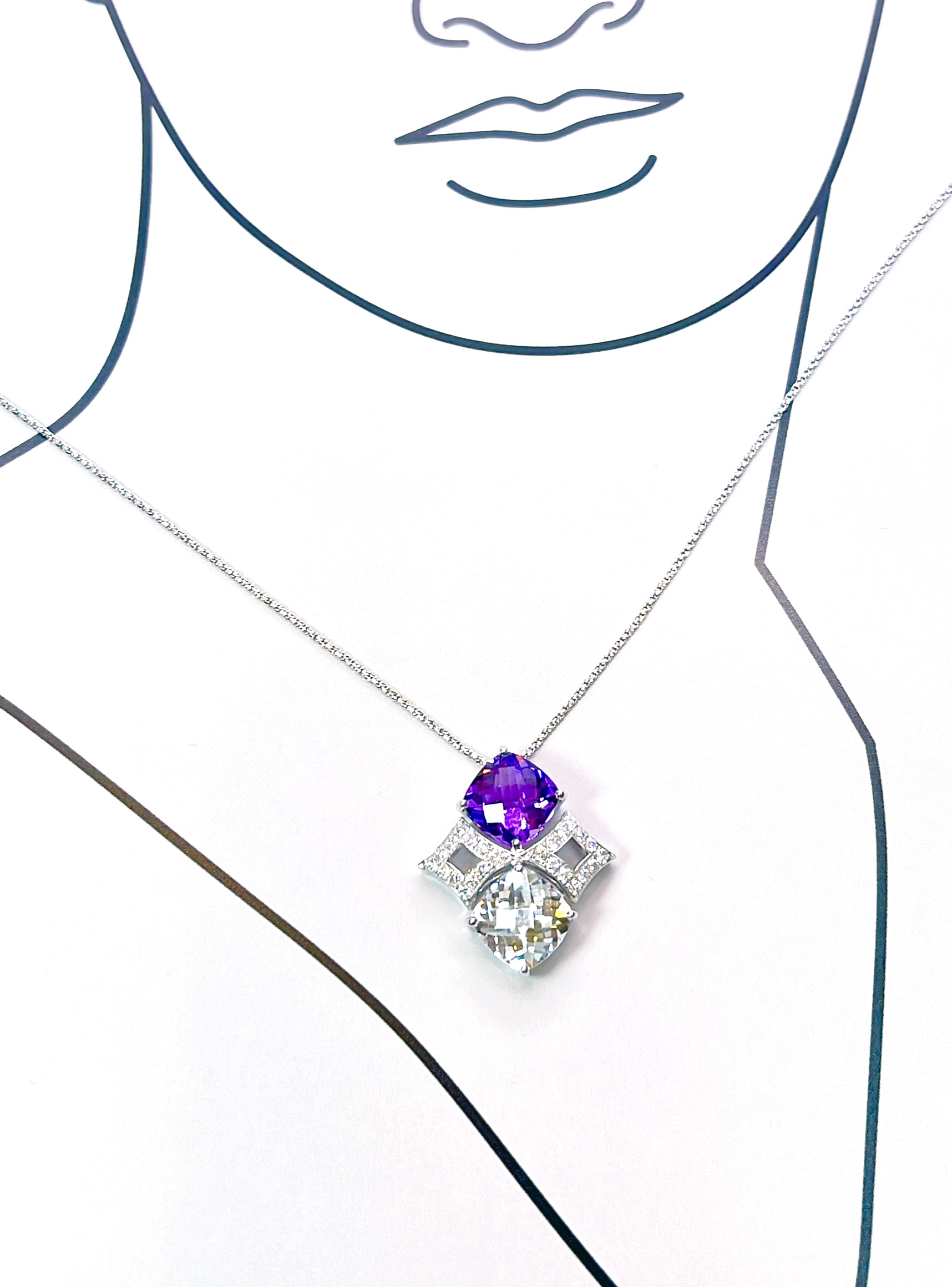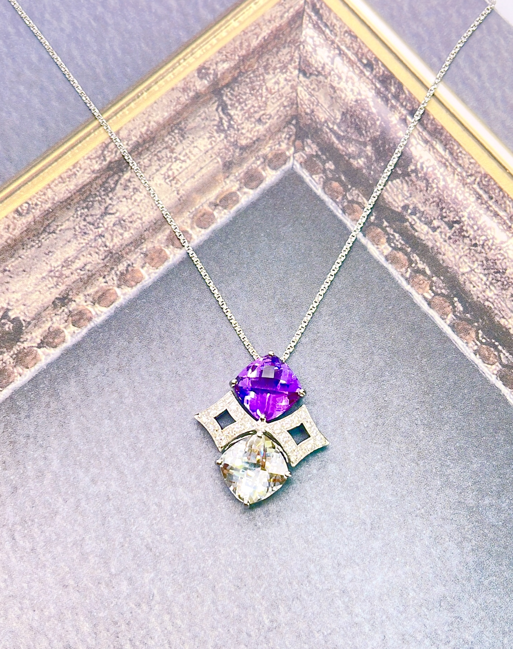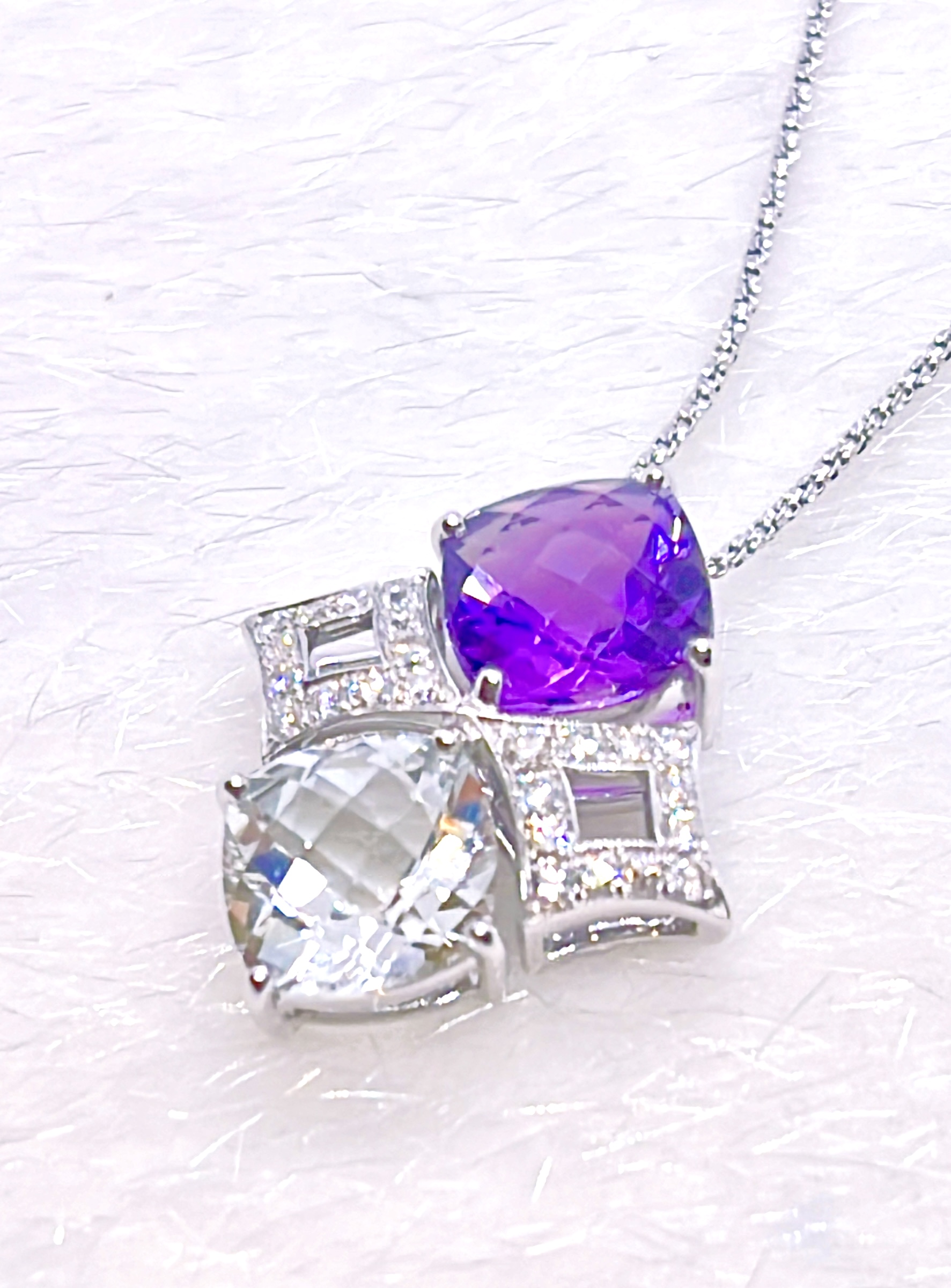 珍しいクッションシェイプチェッカーフラックカットのアメジストとホワイトトパーズのルースを