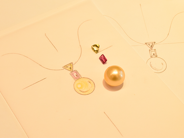 お客様のご希望がピンク系とグリーン系の色石でした。