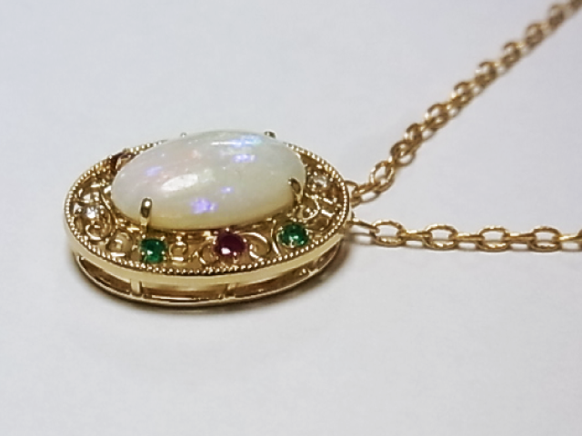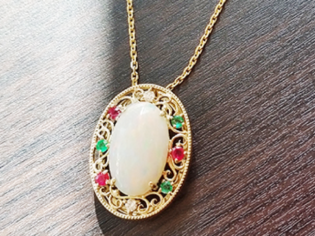 オパールには遊色効果、つまり光や角度によって様々な色が出るという性質があります。この特質はK18ゴールド素材と組み合わせることでプラスに作用し、オパールの魅力を引き出しております。